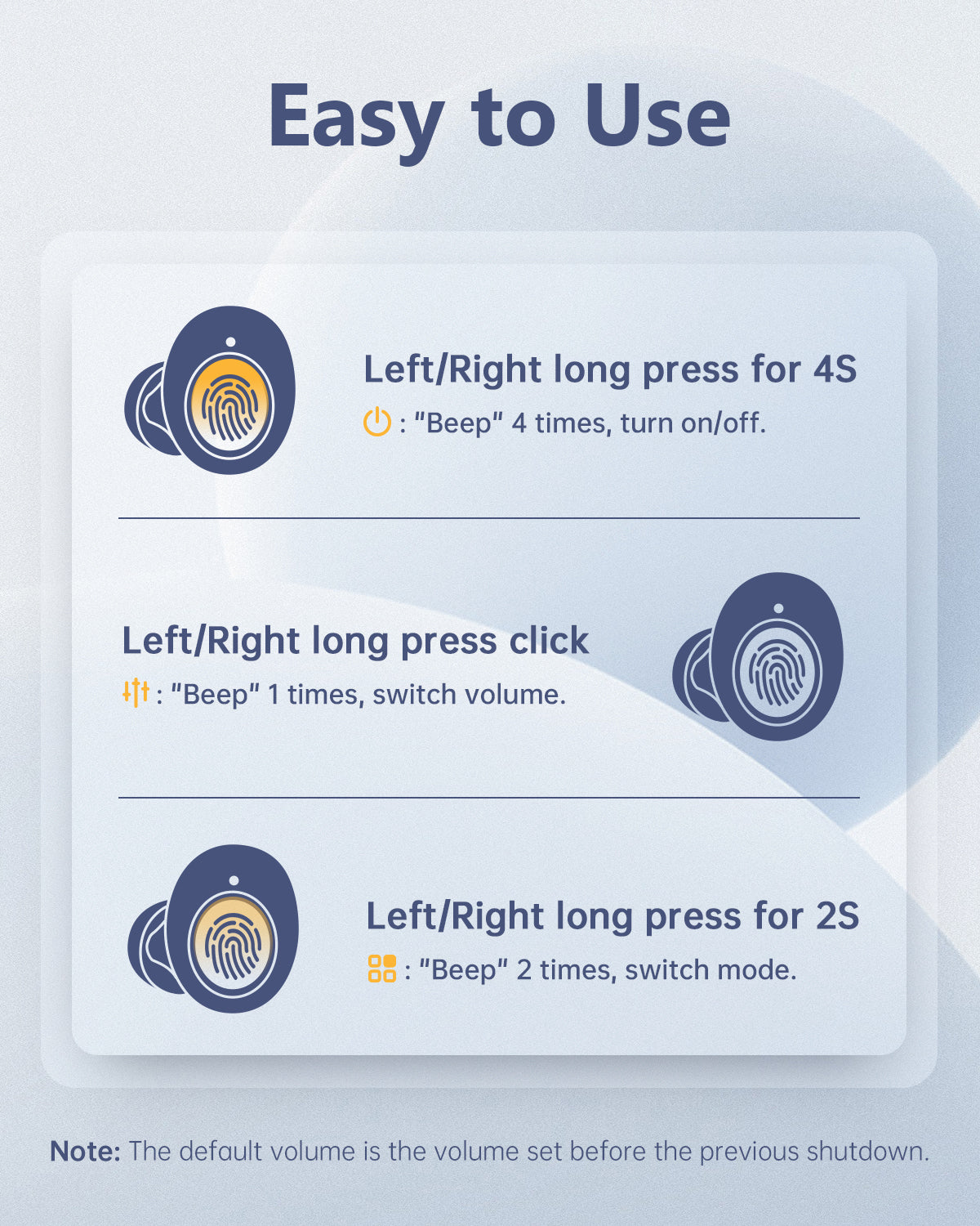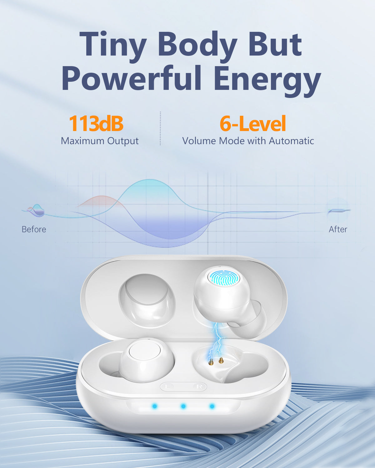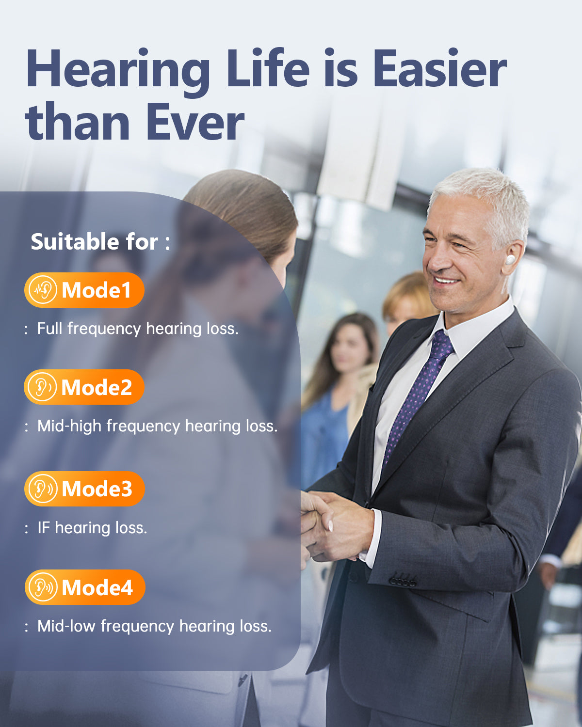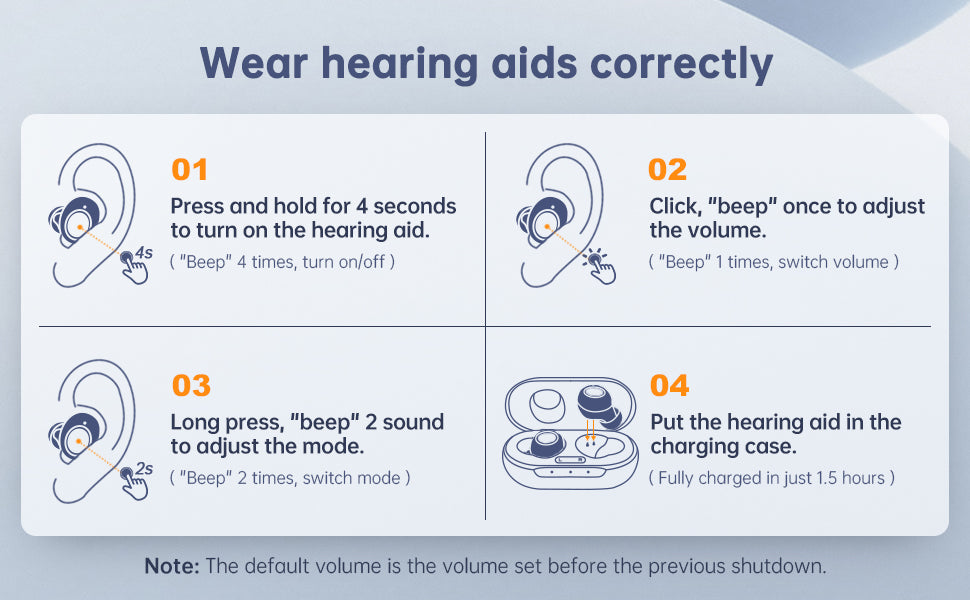 After the hearing aid is worn tightly, long press the touch button on the hearing aid to turn it on. Press and hold the touch button until 4 beeps, the hearing aid will turn off. The hearing aid has six volume levels and four modes. For specific adjustment methods, please refer to the details page and user manual. It is the best choice for the elderly and people with mild and moderate hearing loss.